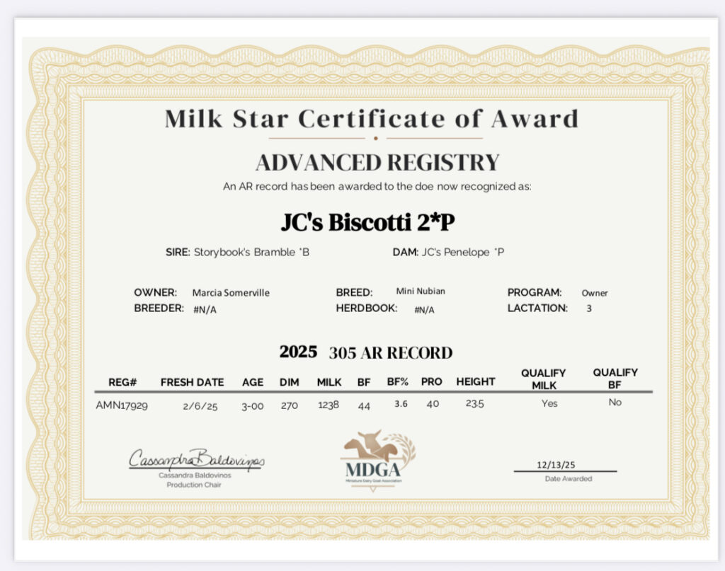 Biscotti easily earned her milk star as a two-year-old first freshener, despite being one of the smallest does in our barn.