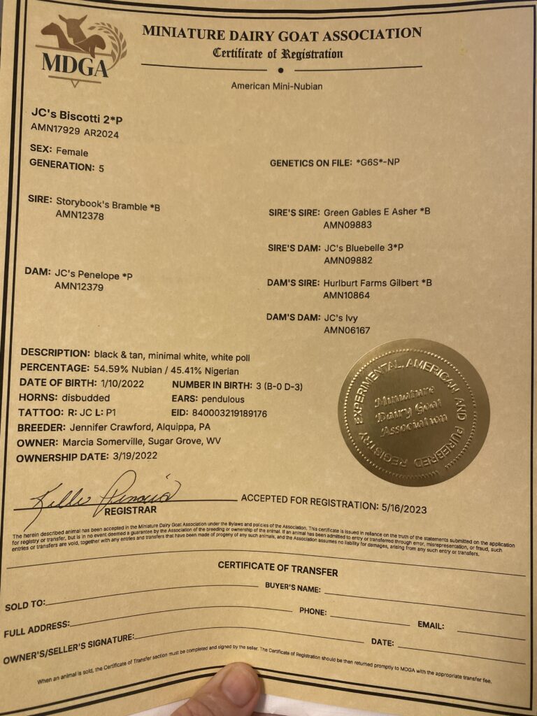Jen bought Storybook’s Bramble *B from me. In 2021, she bred him to her stellar doe, JC’s Penelope *P, who was a first freshener, producing Biscotti.