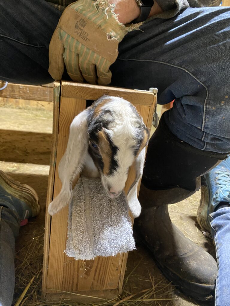 This was a repeat breeding. We were hoping for a doeling, and we got one; her name is Storybook’s Chablis. Champagne had two boys, and one is left: Storybook’s Seltzer *B was under contract but because of unexpected financial challenges, his buyer was not able to follow through. He is a handsome, moonspotted, blue-eyed, horned (and disbudded) boy. Seltzer is offered at $500.