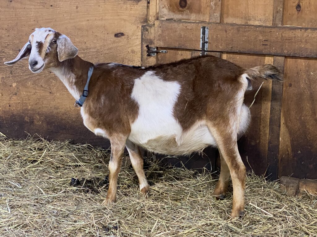 Pansy is a FF at age three (didn’t take last year) and her udder is fantastic. We are confident in presenting both of her boys as breeding bucks. Both are moonspotted: Butternut has lighter moonspots, and is horned. Butternut is offered at $475.