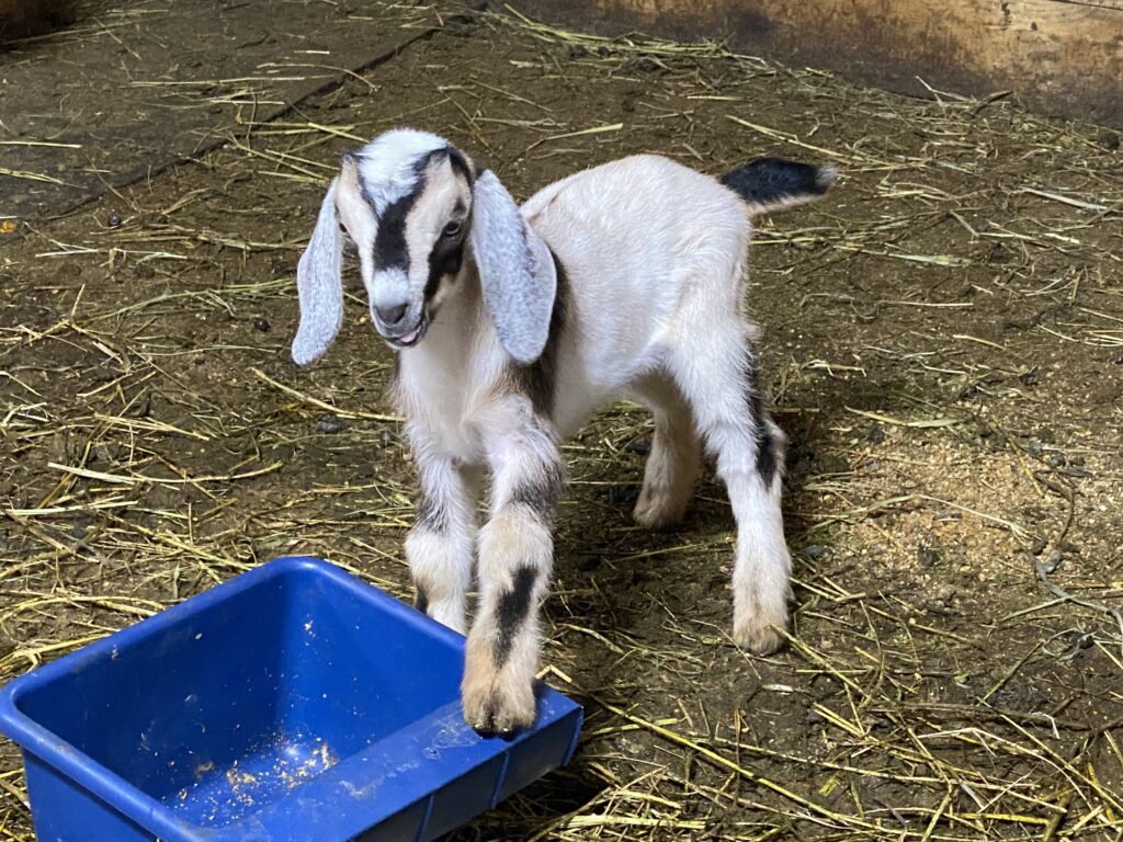 Twix gave us boy/girl twins, and we will be retaining her doeling (Caramella) for awhile to evaluate her. Twix was a strong milker as a first freshener, and we are hopeful that she’ll gain her production star this year. If so, her boy would be a *B. He is called Storybook’s Bounty. He is moonspotted with brown eyes. He seems to be polled, but we evaluate for weeks before confirming. He is very solid, with lovely breed character and looong ears. Bounty is offered at $500.