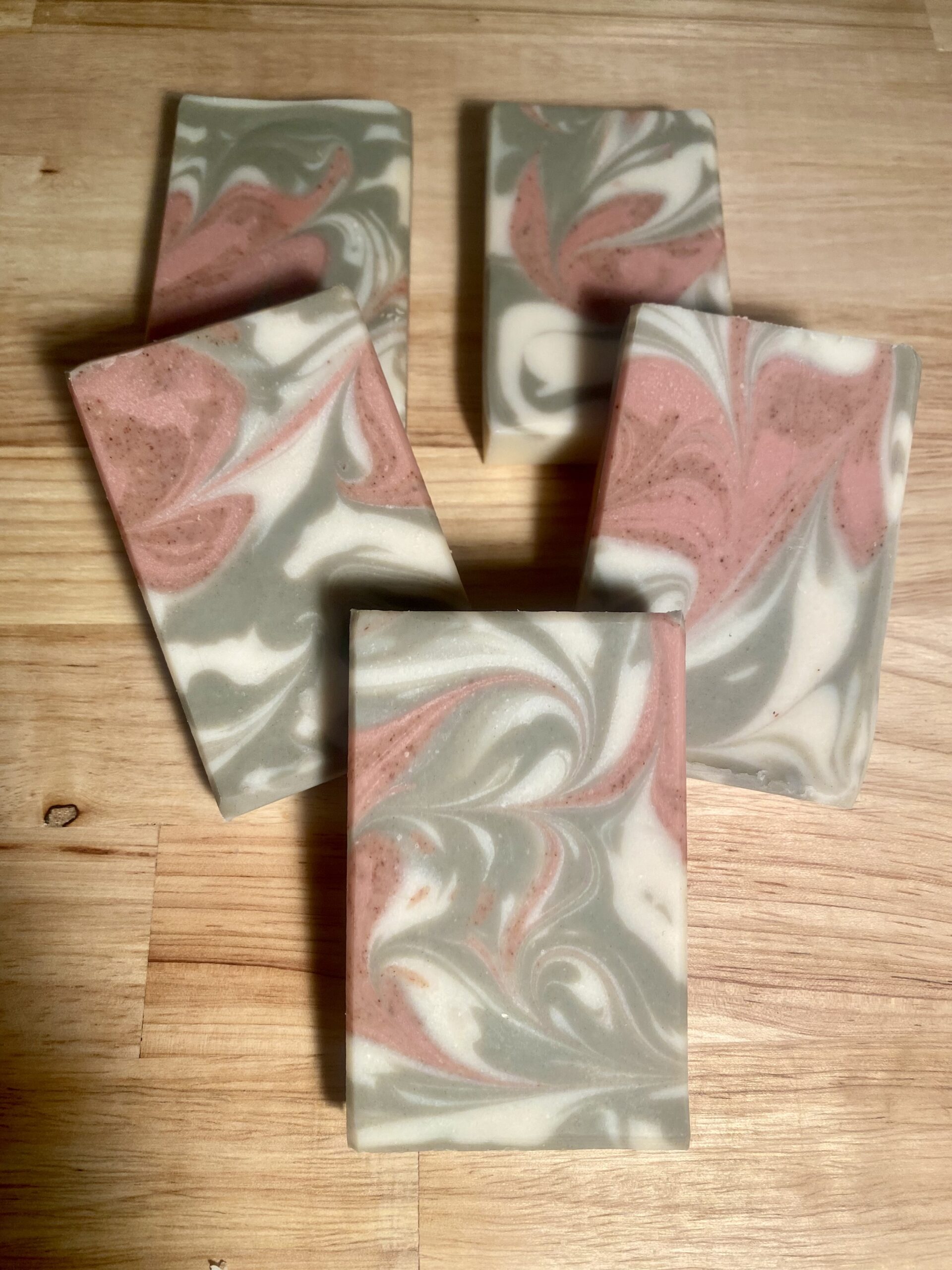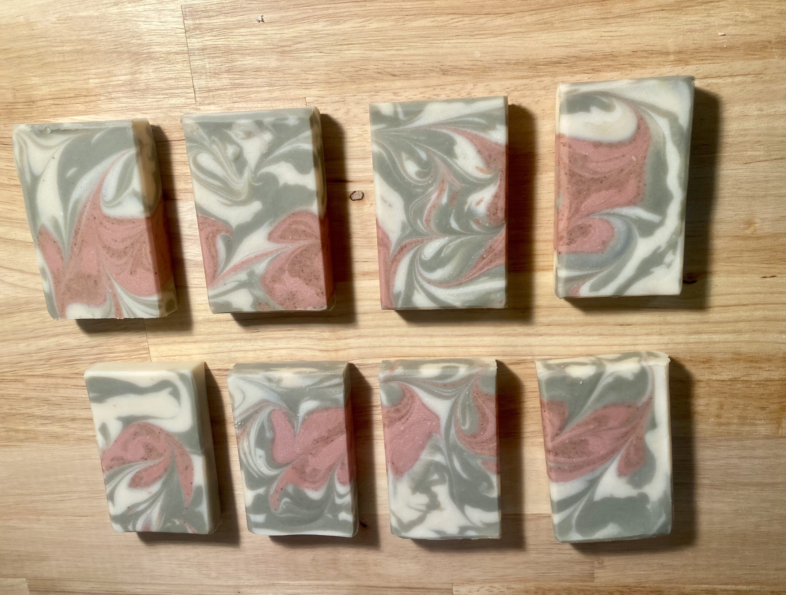 Bars are 4″ long by 2.5″ wide by 1″ thick. Each bar has a totally unique swirl design, but the colors are the same throughout.