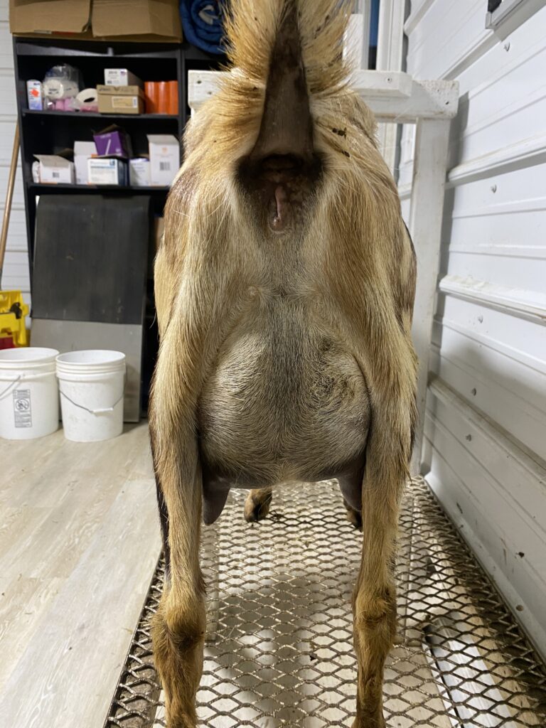 Here is Beauty’s 2F udder at 2 weeks fresh. She had triplets, and they are all fat and happy.