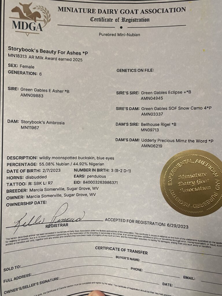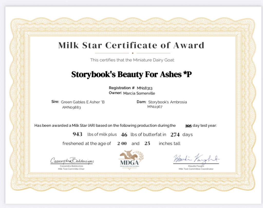 In 2021, Mimzie easily earned her production star. In fact, in the MDGA national rankings for milking Mini Nubians, she ranked 7th nationally for milk weight, and 10th in butterfat weight. She was 5 years old that year.