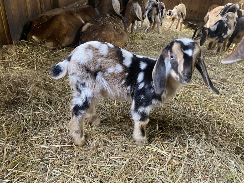Beauty is beautiful! She is a wildly moonspotted doe, very much like her paternal granddam, Green Gables Snow Camo 3*P, and her sire, Green Gables E Asher *B. She’s about 9 months old here. She has brilliant blue eyes as well!