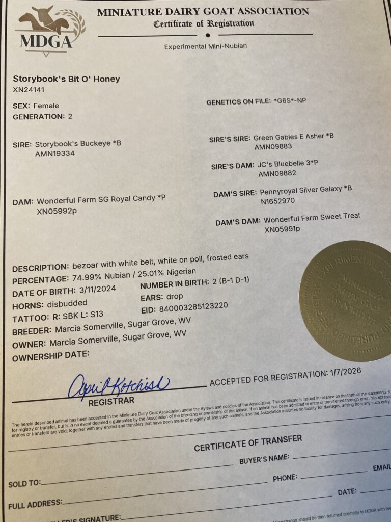 We were so thrilled when God gave us this girl! She is out of one of our favorite does, Wonderful Farm SG Royal Candy *P. She was sired by our own Storybook’s Buckeye *B. She has lots of milky genes in her makeup, and we love her big eyes, looong ears, and excellent topline. Like her dam, she has a great brisket and wide, flat rump.