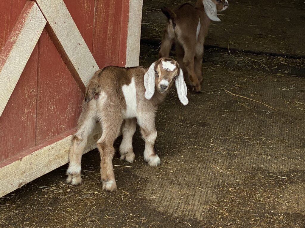 Honey was bred to Cedar Creek’s Outlaw Blues *+B for her first freshening. She kept us waiting four long days (and nights) past her due date! Her girl/boy twins are adorable, and her FF udder is lovely! We named them Storybook’s Taffy and Storybook’s Toffee. Toffee has beautiful blue eyes. Both have looong ears.