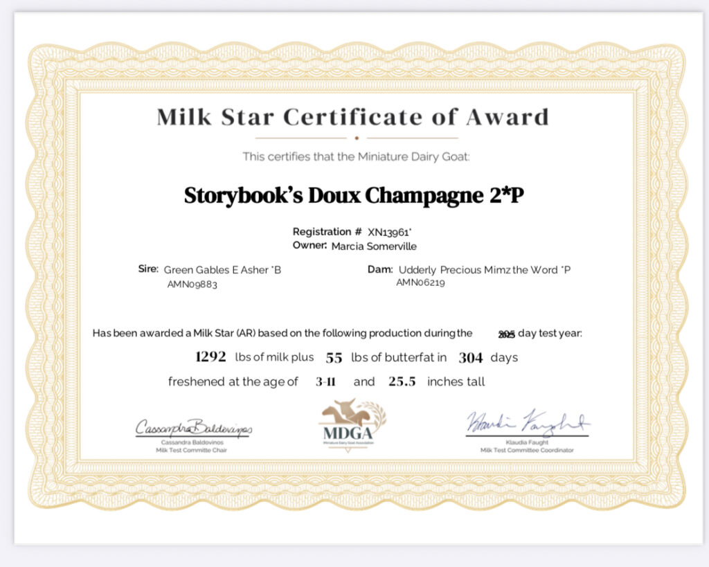 She earned her milk star in 2024 as a 2nd freshener, nursing triplets. See her certificate below.