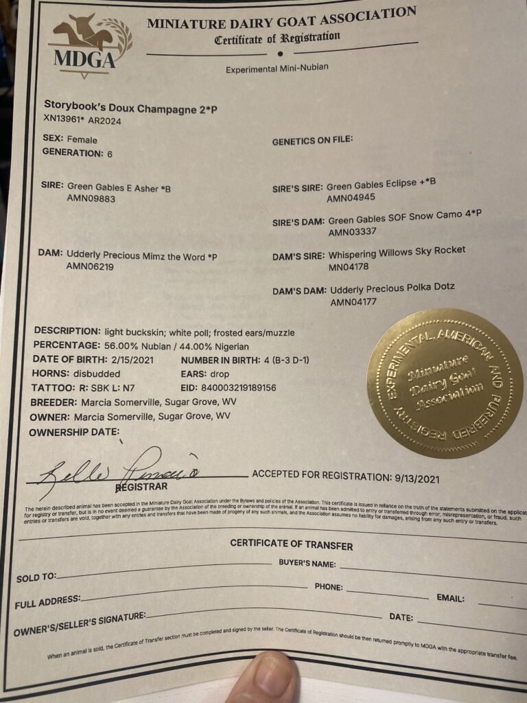 I had tried for two years for this pairing! I love her dam, Udderly Precious Mimz the Word *P and her sire Green Gables E Asher *B, and they finally gave us quads in 2021, and Champagne was the only girl. (You can click on these names to see pedigrees and pictures.)